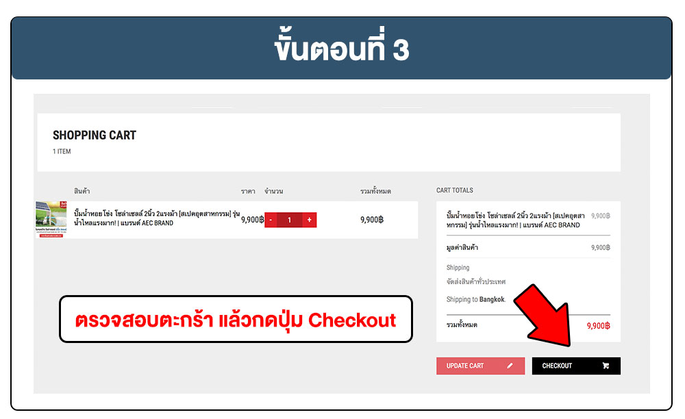 ขั้นตอนที่ 3 ตรวจสอบตะกร้าสินค้า แล้วดำเนินการกดปุ่ม Checkout